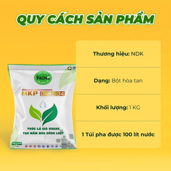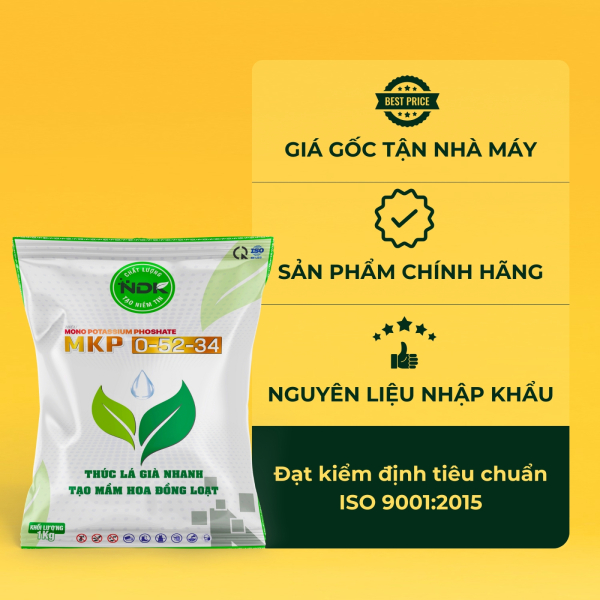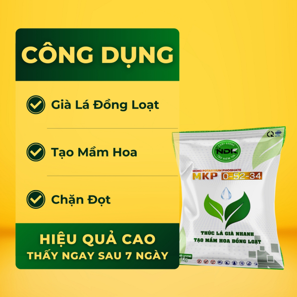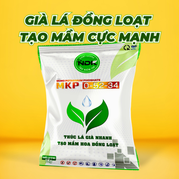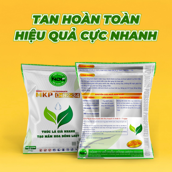 Chào Sinh. Phân MKP 0-52-34 giúp kích thích rễ phát triển mạnh, cây xanh tốt, lá dày và đồng loạt già. Ngoài ra, phân còn giúp cây mập đồng, ra hoa đồng loạt, chặn đọt hiệu quả và tăng khả năng hình thành mầm hoa, ngay cả trong điều kiện nghịch vụ.